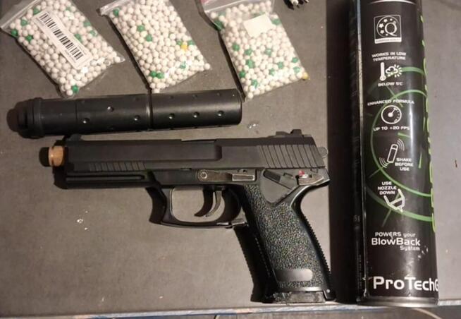 Gazowa replika pistoletu MK23 w wersji Special Operations - wyposażonej w odkręcany tłumik. Pistolet jest napędzany green ...